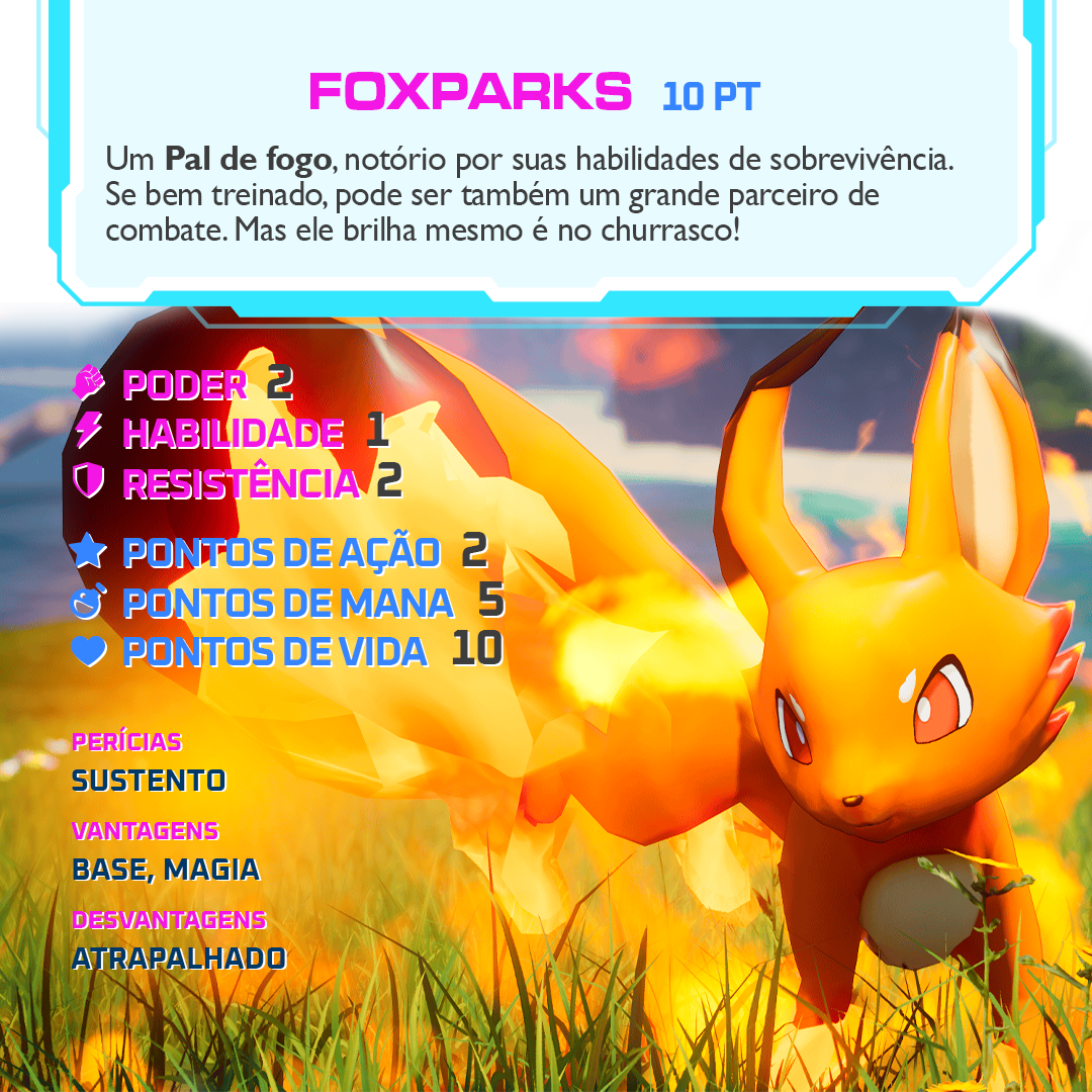 - Sustento: Foxparks é um grande Pal aliado em questão de sobrevivência. É capaz de assar comidinhas para aplacar a sua fome e criar lingotes de metais.