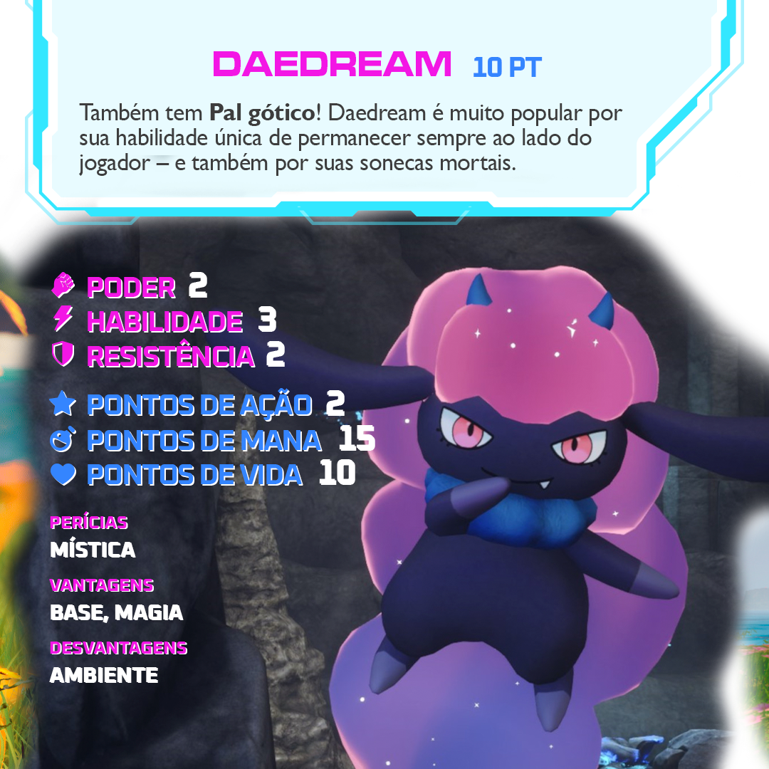 - Mística: Daedream é um Pal sombrio e sobrenatural, capaz de envenenar adversários e manipular os sonhos alheios.