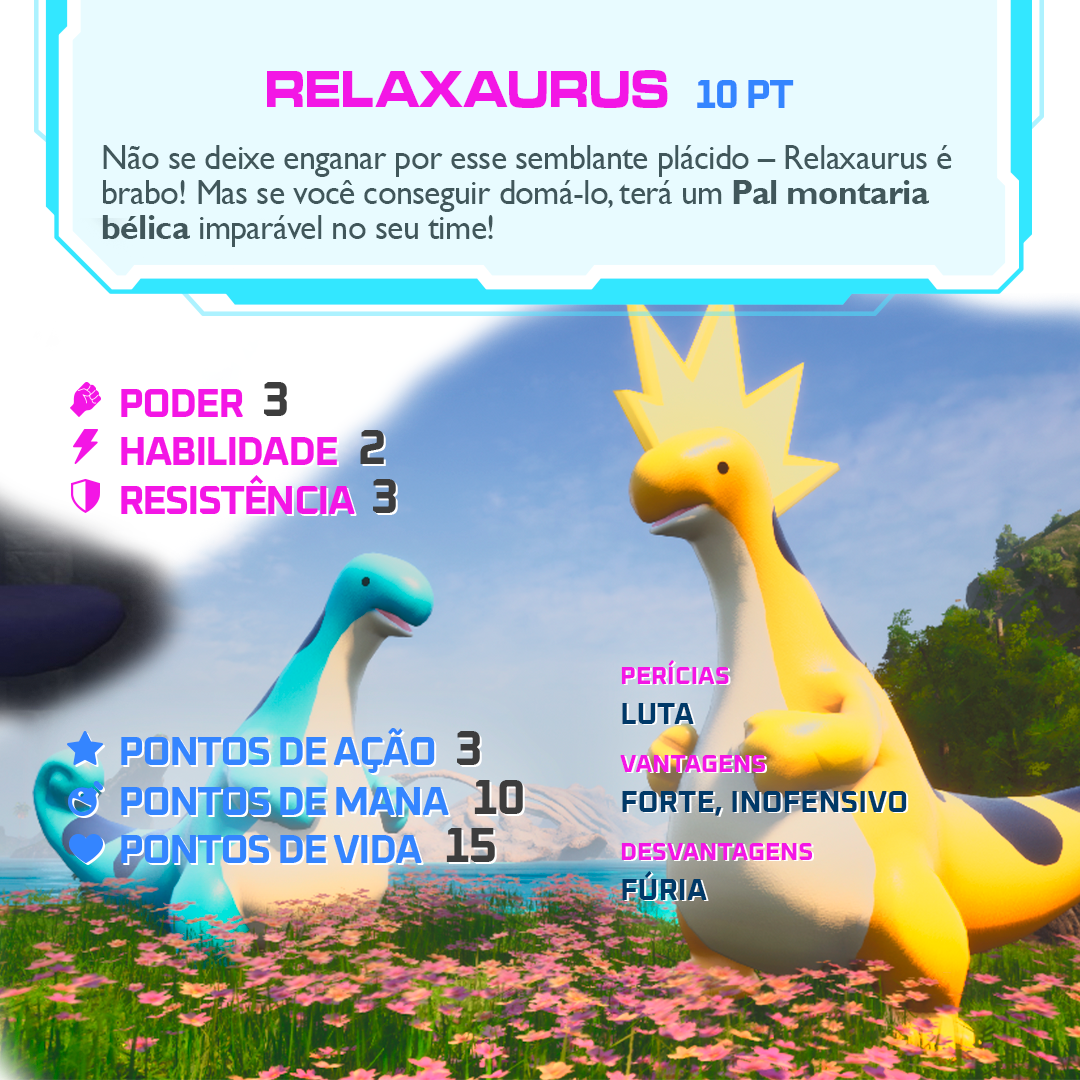 - Inofensivo: talvez o grande trunfo desse Pal seja seu aspecto blasé. Quem desconfiaria dessa carinha? Em combate, por surpreender seu oponente, Relaxaurus ganha uma ação extra antes do primeiro turno.